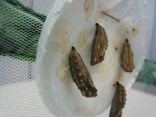 When the larva have all changed into the chrysalises, they cloth covering the top of the container can be removed and attached inside the habitat.