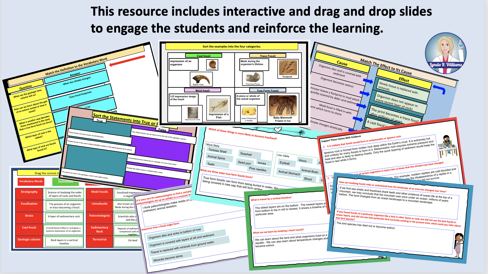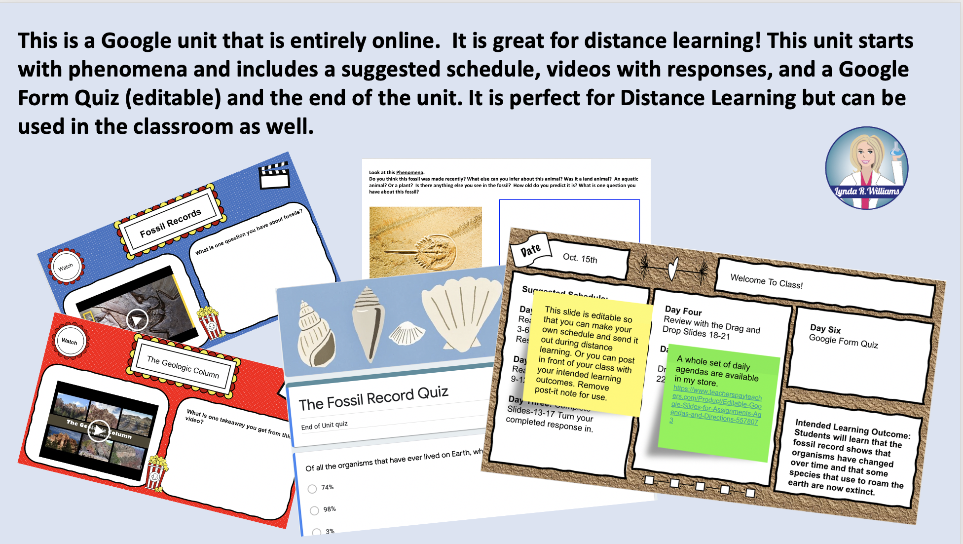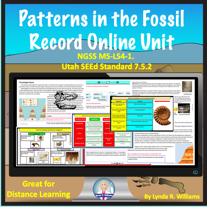 This resource is an online middle school science unit on analyzing the fossil record and looking at patterns that could tell us about the history of life on Earth. This resource is entirely on Google. The slides have interactive components that the students can type right on and also have drag and drop activities and videos to watch. Students will read informational text passages about the fossil record and will answer questions. The unit ends with a quiz (editable) in google forms