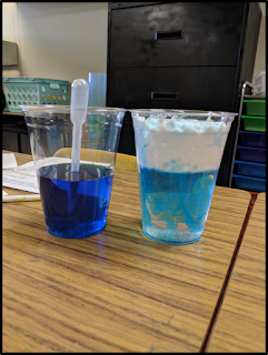I do this experiment with my kids after we’ve discussed types of clouds, what precipitation is, and the water cycle. I start with asking the kids how much water they think it takes for the clouds to rain. A really fun analogy a student brought to my attention this year was that clouds are like big sponges, a little bit of water won’t make it drip, but a soaked sponge will drip and can’t hold any more water.For this experiment, I wouldn’t suggest having the students in groups of more than three. I had a few groups of two, and a few groups of three this past time and it was great. Everyone felt like they were a part of the experiment and got to put enough drops in.