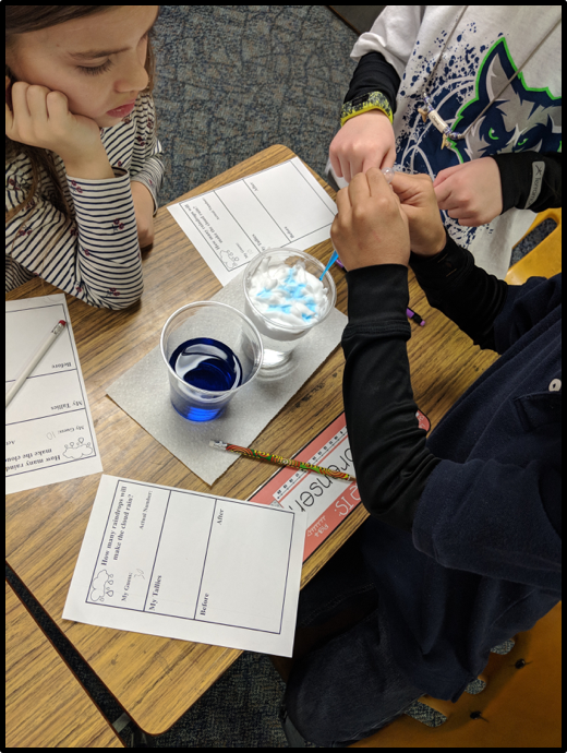 I do this experiment with my kids after we’ve discussed types of clouds, what precipitation is, and the water cycle. I start with asking the kids how much water they think it takes for the clouds to rain. A really fun analogy a student brought to my attention this year was that clouds are like big sponges, a little bit of water won’t make it drip, but a soaked sponge will drip and can’t hold any more water.For this experiment, I wouldn’t suggest having the students in groups of more than three. I had a few groups of two, and a few groups of three this past time and it was great. Everyone felt like they were a part of the experiment and got to put enough drops in.