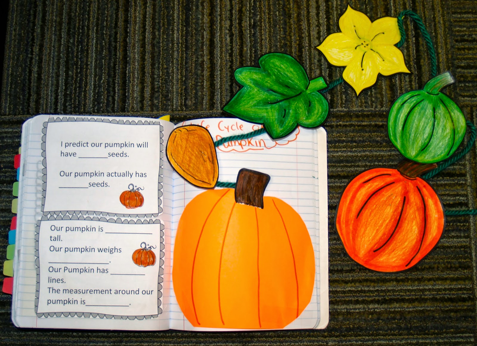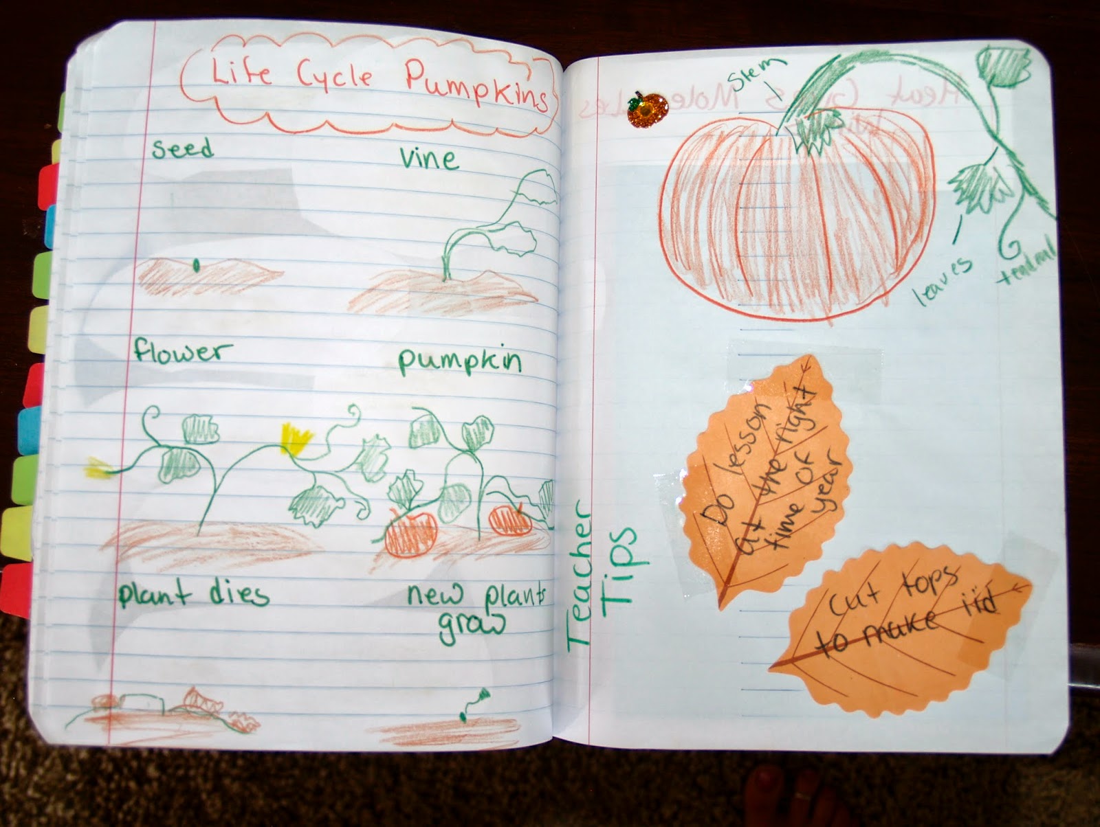 Make a large pumpkin pocket.  Using green yarn connects the stages of the pumpkin’s life cycle. Super cute notebook idea for younger grades.