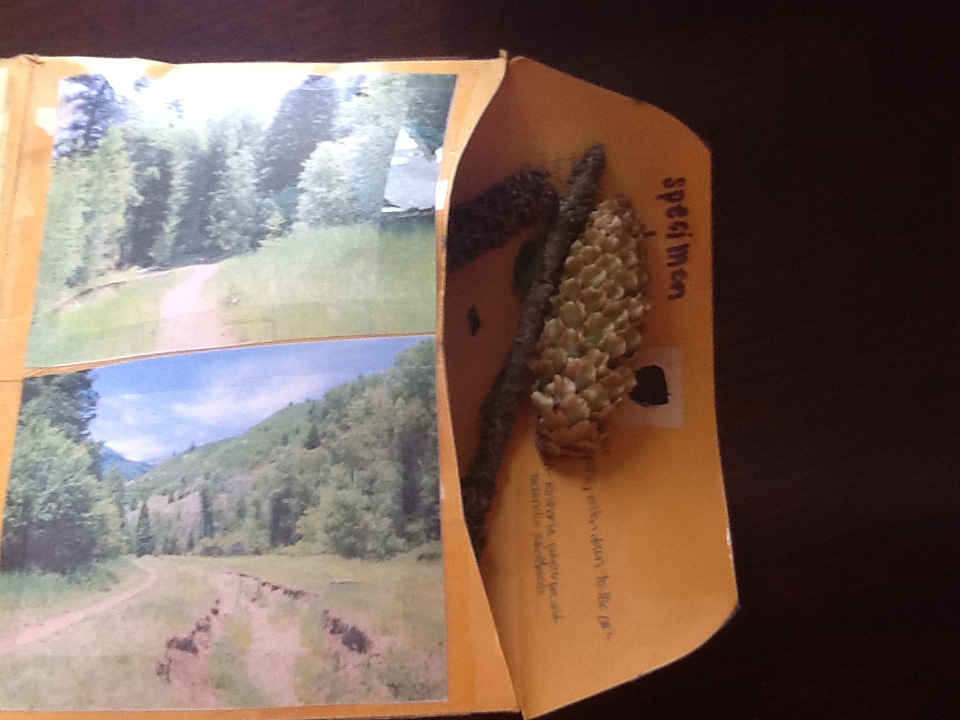 Specimens: Include pressed leaves, feathers, flowers or other small specimens. Your finished field journal should have at least three specimens. Try to identify them and label them. Be sensitive when collecting and obey all laws regarding the picking of live vegetation. Items too large or awkward to collect and include in your field journal may be photographed and the photos can be added to your field journal. Examples of items too large to add to your notebook might be a nest, animal scat, animal tracks, animal remains, etc. You still are required to have some actual specimens from nature. Hint: Clear packing tape seals the specimen down nicely and seems to preserve it a little.