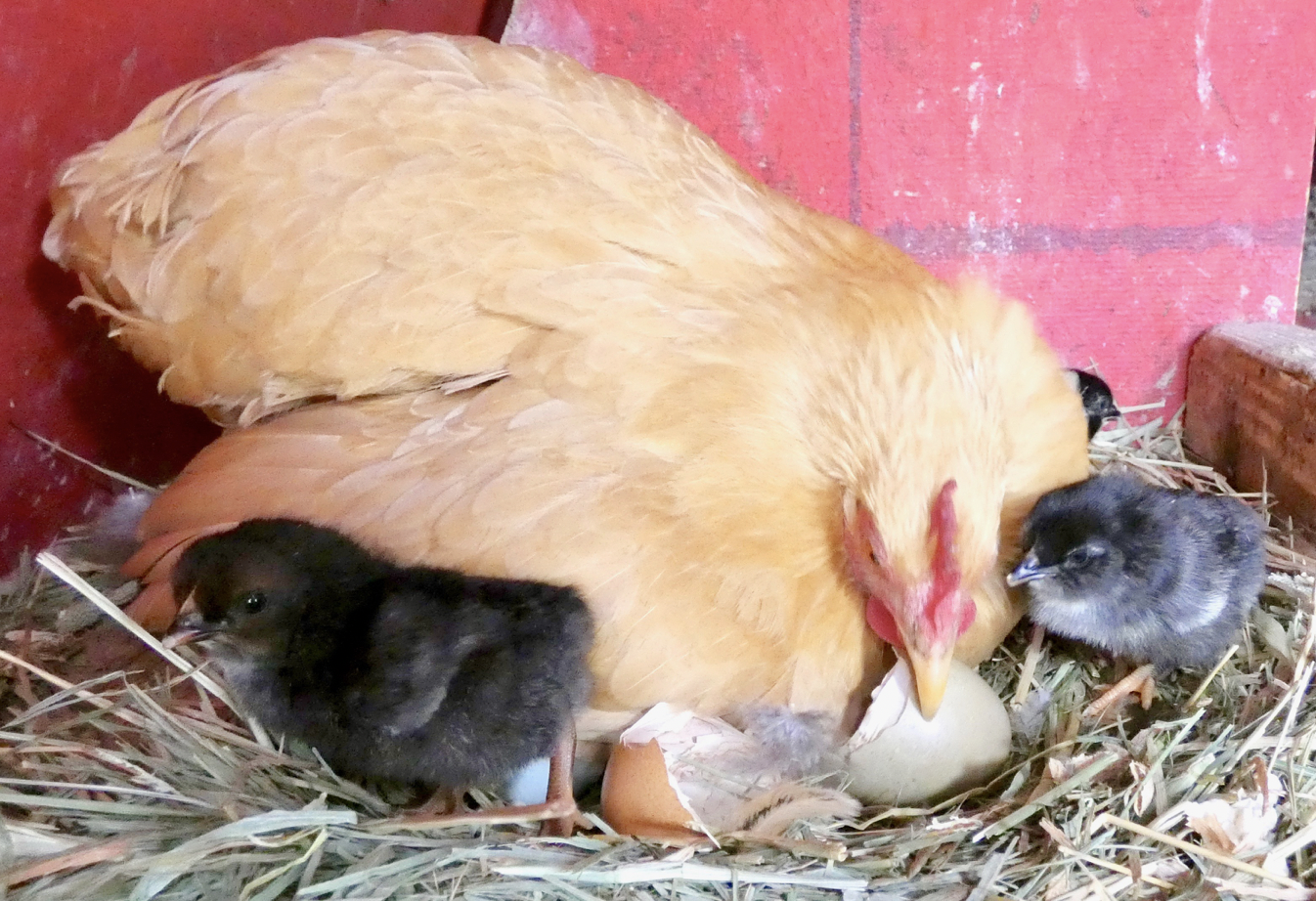 Each egg I presented to her as she clucked excitedly and then rolled the egg towards herself and tucked it in. She had to spread out kind of wide to cover them all, but she did it.