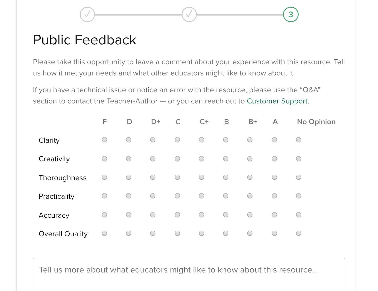 You will then see a scale for public feedback. This is the important one. Be sure to tell what part of the resource you enjoyed or liked or how it helped you as a teacher.
