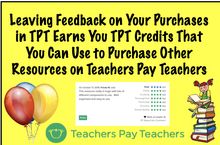 I am continually surprised that so few people seem to know that leaving TPT Feedback can earn you TPT credits that you can use to purchase other items on TPT! It is a great way to get a discount! AND that you can do it at anytime! Have not ever left feedback…no worries..you can do so now and collect all those retroactive TPT credits.