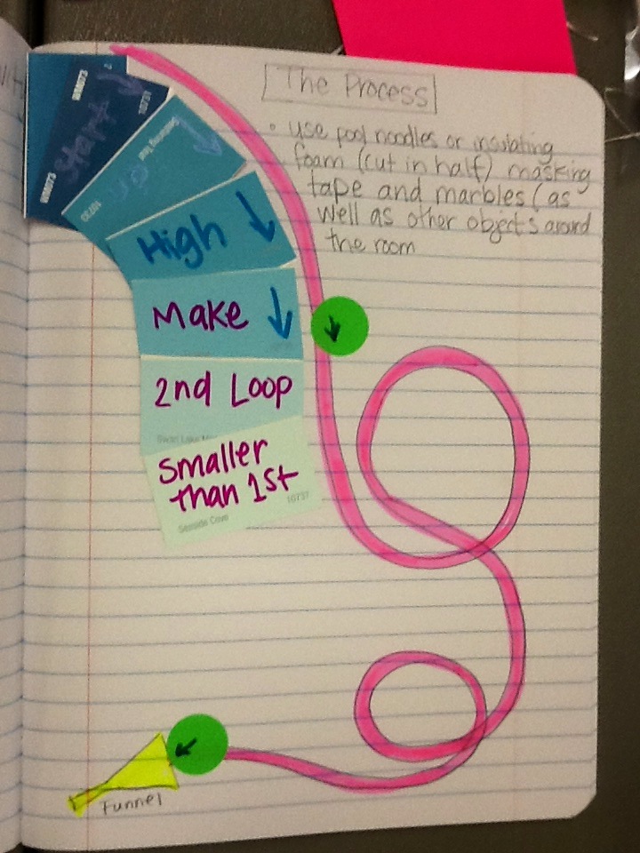 Students were given foam insulator tubes that had been sliced in half lengthwise, masking tape and marbles and asked to create a roller coaster design using what they know about gravity and motion.
