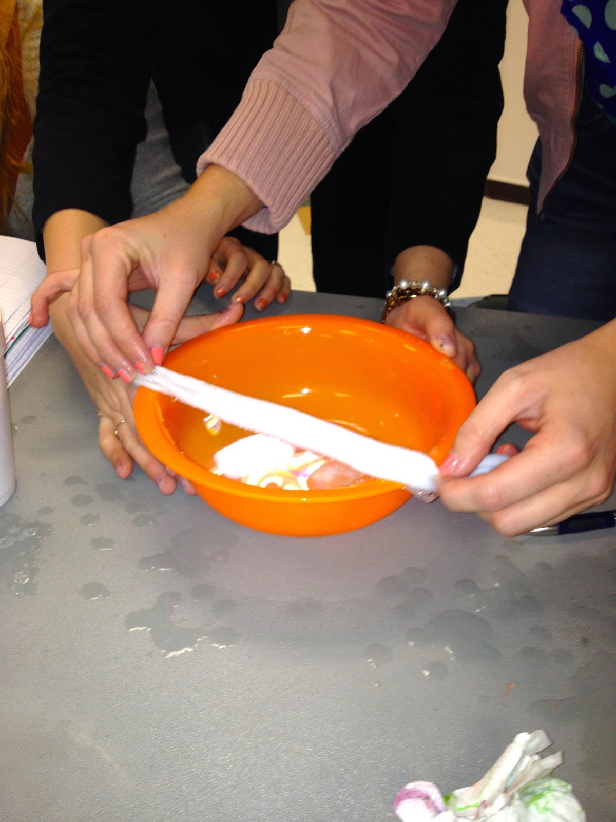 2. Place the strip of cloth in the bubble solution. Get a generous amount of solution on the cloth.