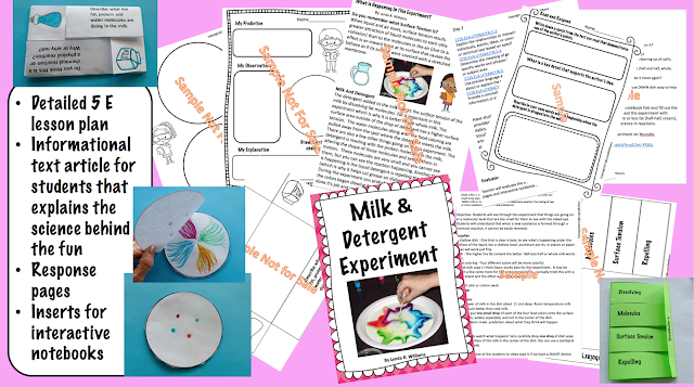 This lesson on Milk, Detergent and Food coloring is now available in my store!  It comes with interactive notebook inserts, informational text article, response pages and more.
