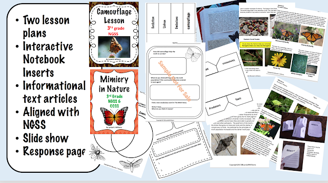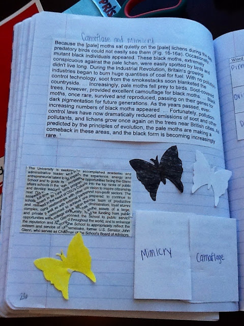 I introduce the concept of mimicry by having them read an informational text article on mimicry. The students define these two words in their interactive notebook and we place a piece of newspaper down on the notebook. The students cut a moth shape out of newsprint and we place that on top. It really works and you can hardly see the moth!