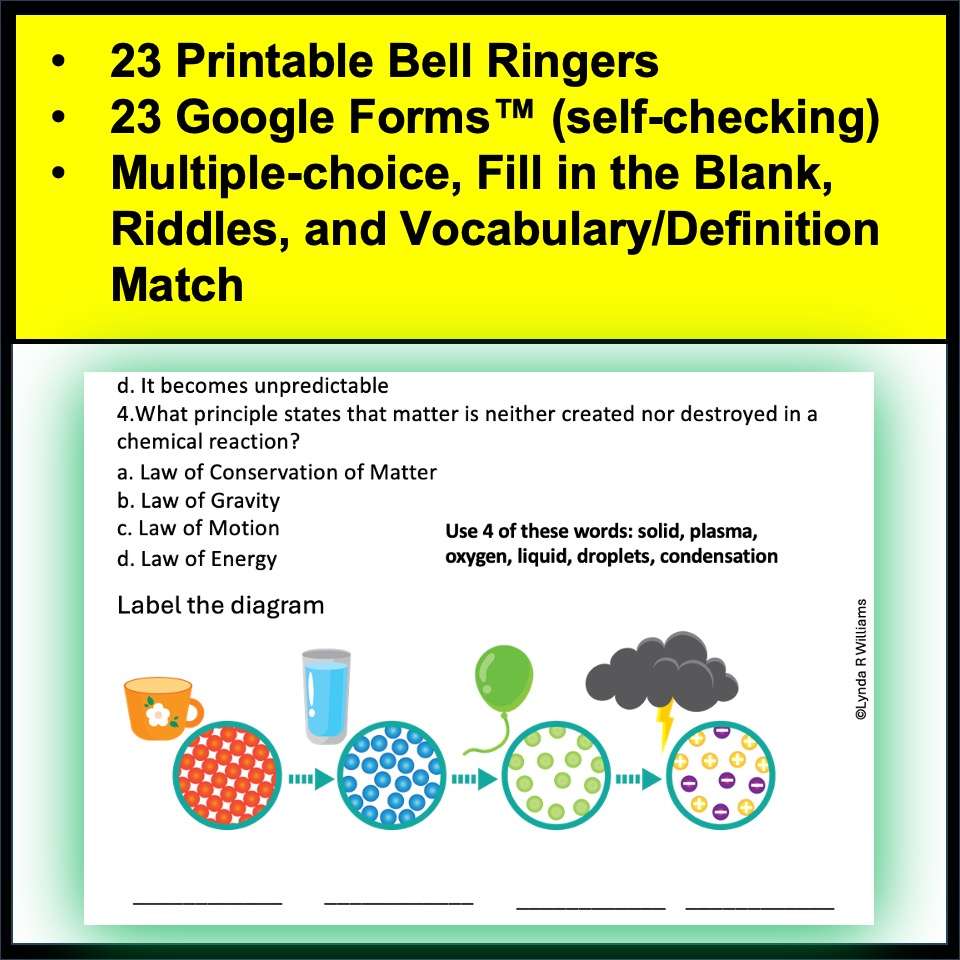 Do you want some 5th-grade science bell ringers? They are a great way to review 5th-grade science concepts on matter and gravity. This set includes 23 bell ringers for 5th-grade Science. Each bell ringer will take about ten minutes for students to complete. This is SET THREE for 5th-grade Bell Ringers and covers a different set of standards than SET ONE and SET TWO. They come in printable full-page format (PDF) and Google Forms™.