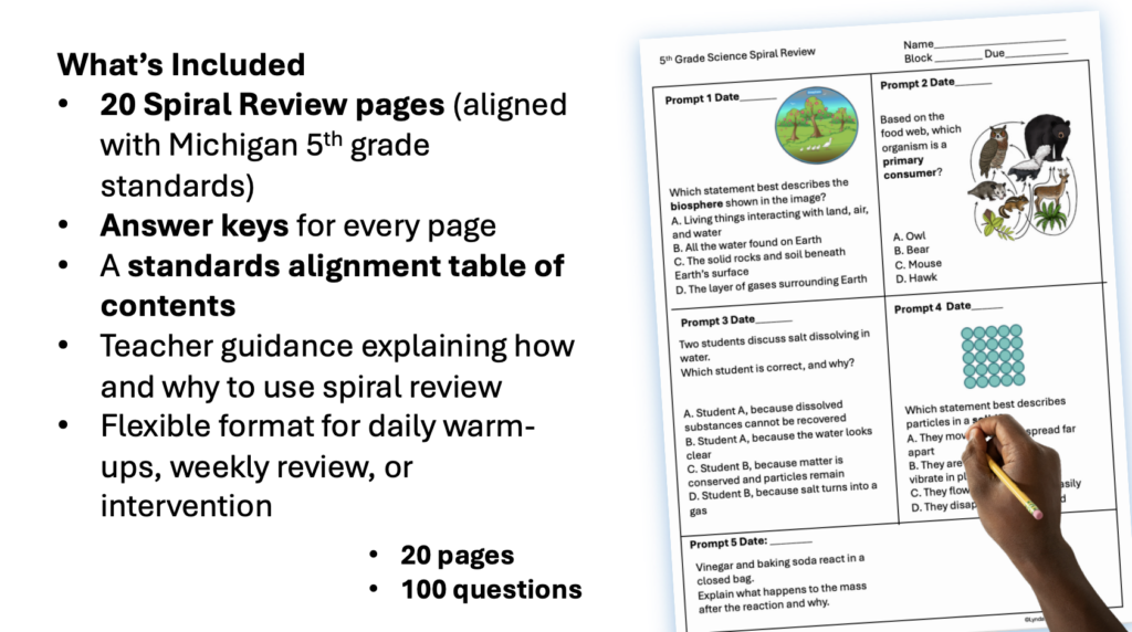 - ✔️ Daily spiral review pages with mixed 5th-grade science concepts