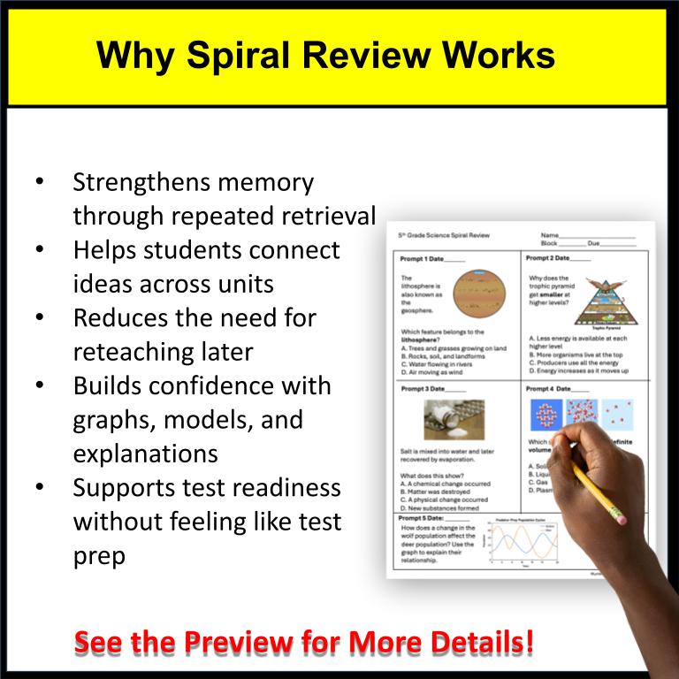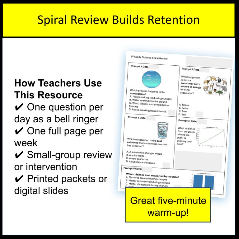 Each page provides short, focused review questions that revisit key 5th-grade science concepts throughout the year. Topics are intentionally mixed so students repeatedly practice skills over time, helping close gaps and reduce test anxiety.