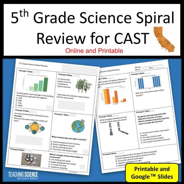 Daily 5th-grade science spiral review warm-ups aligned to NGSS and the California CAST. Includes short, focused practice with California-specific questions using models, data, and real-world science scenarios to build understanding, improve retention, and support test readiness—all with zero prep for teachers. Great for CAST test prep!