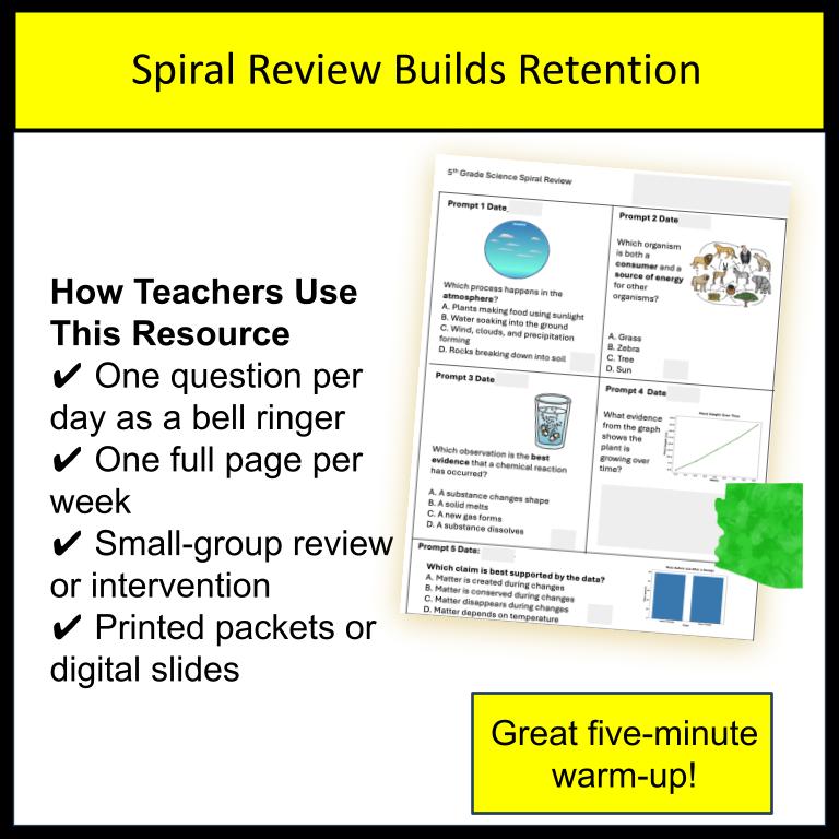 Looking for an easy, no-prep way to review Arizona 5th-grade science all year long? This AzSci 5th Grade Science Spiral Review was intentionally designed to support long-term retention, standards mastery, and confident test preparation—without adding to your planning load. Aligned—aligned with Arizona Academic Standards for Science.