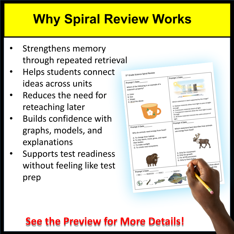This spiral review uses proven learning strategies—retrieval practice, spaced review, and interleaving—to help students strengthen long-term memory and improve transfer of science skills across topics. Short, repeated practice with mixed TEKS-aligned content helps students retain concepts longer and perform more confidently on STAAR-style questions.
