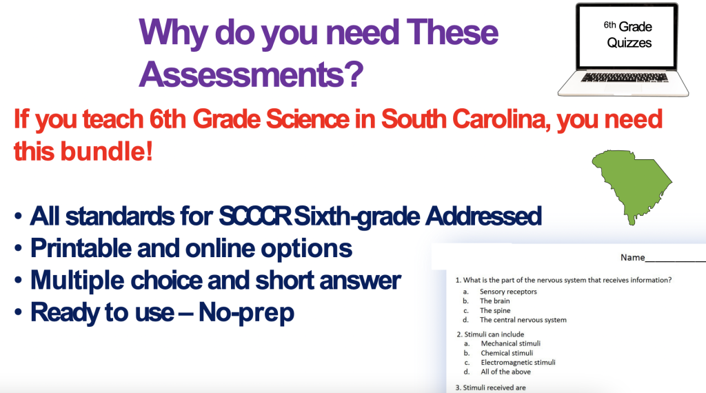 South Carolina Sixth Grade Assessments: This resource includes assessments for all of the South Carolina Sixth Grade Standards, part of the South Carolina College and Career Readiness Standards for sixth grade. This will help you with science review and formative assessment, and 6th-grade science test prep.