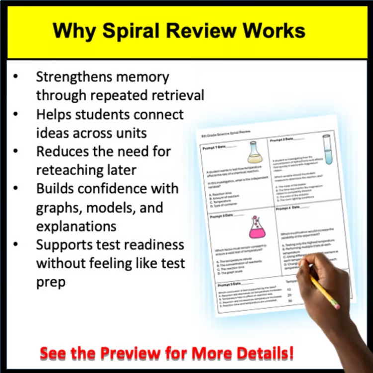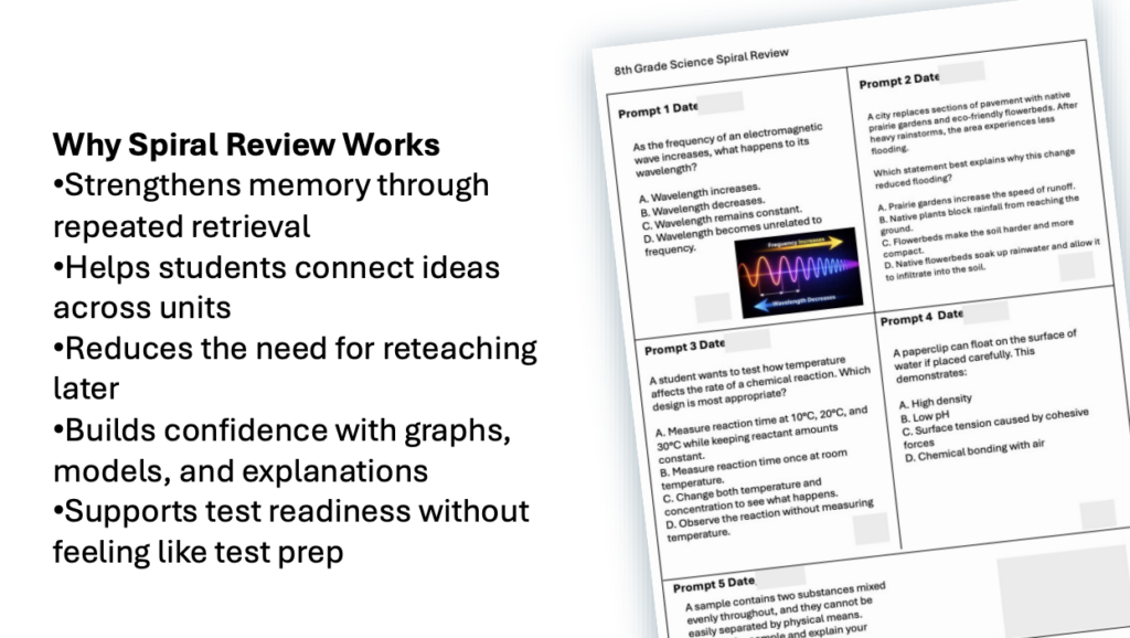 Instead of reviewing one unit at a time, students repeatedly encounter important science ideas throughout the year. This strengthens long-term memory and improves performance on cumulative tests like STAAR.
