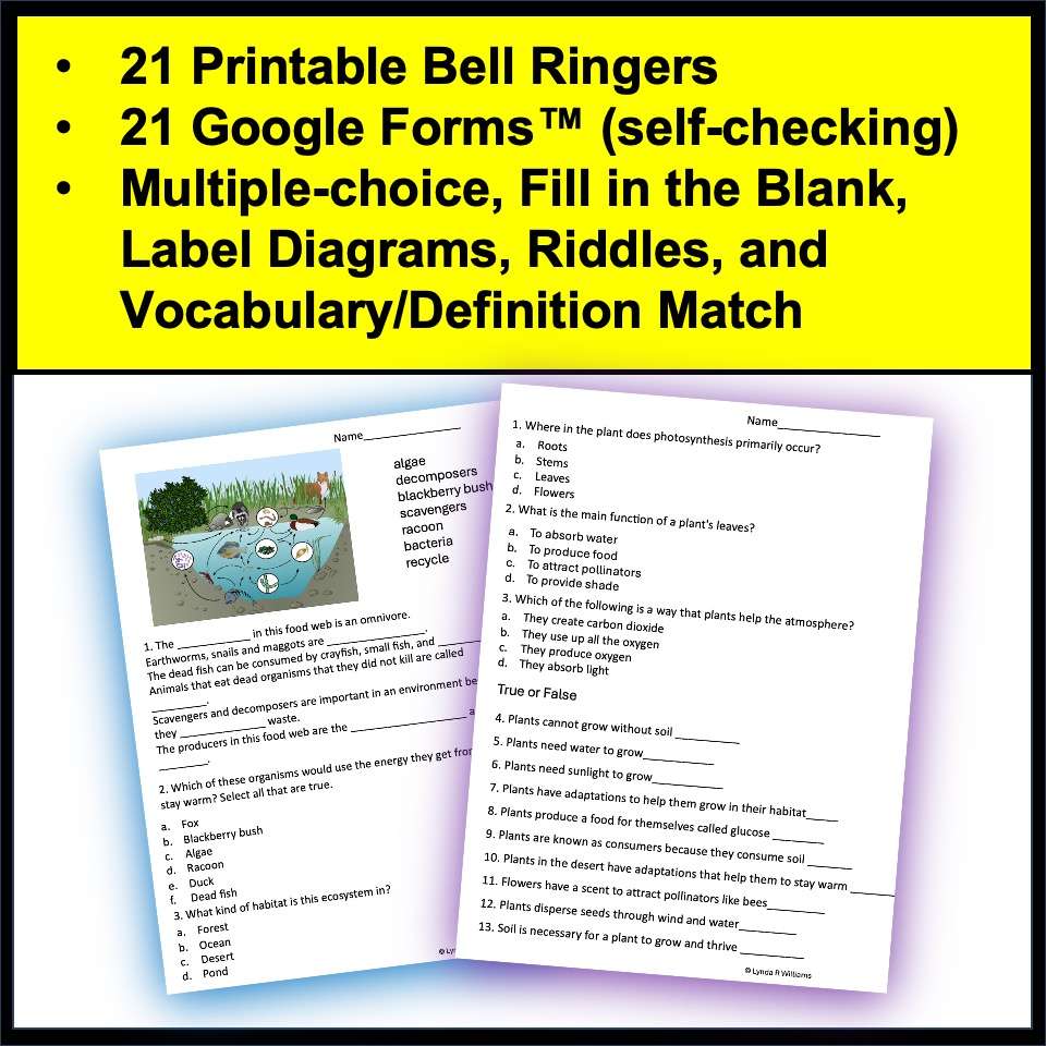 Do you want some 5th-grade science bell ringers? They are a great way to review 5th-grade science concepts on Ecosystems, Plants’ needs, and how energy from food is used to run our bodies. This set includes 21 bell ringers for 5th-grade Science. Each bell ringer will take about ten minutes for students to complete. This is SET TWO for 5th-grade Bell Ringers and covers a different set of standards than SET ONE. They come in printable full-page format (PDF) and Google Forms™.