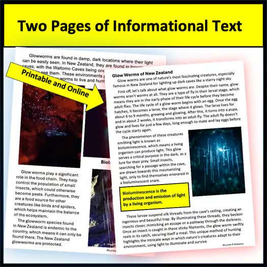 Do your students know about bioluminescence? Why do some animals glow? In this informational text unit on the glowworms of New Zealand, students will learn about the adaptation of bioluminescence and how this helps glow worms to survive in their habitat. Students will practice reading informational text while learning about the Glowworms of New Zealand.