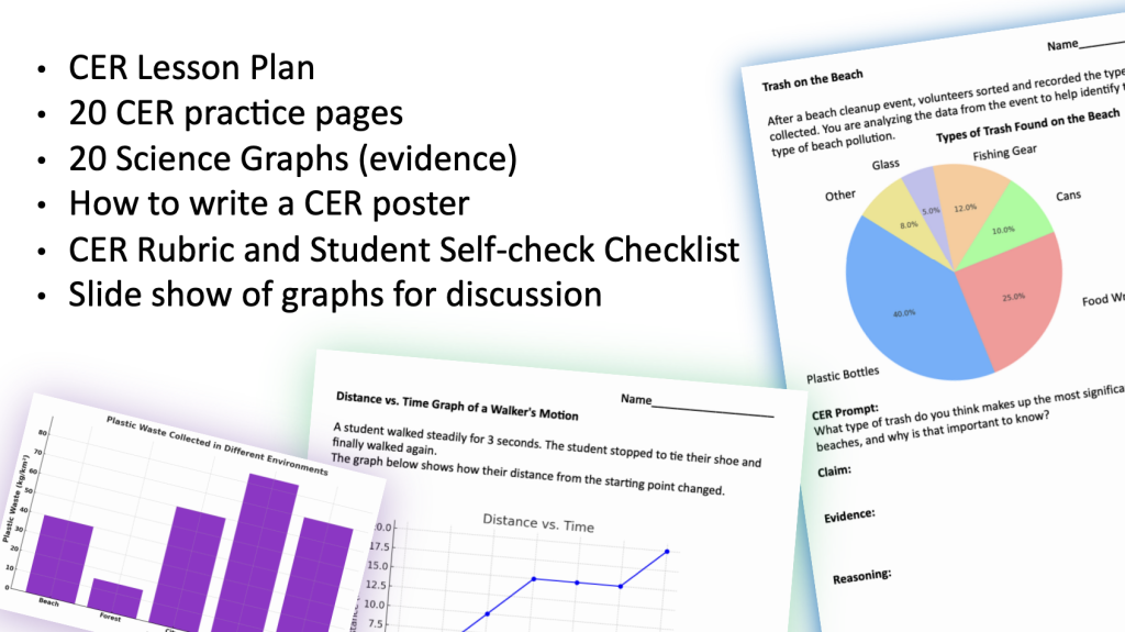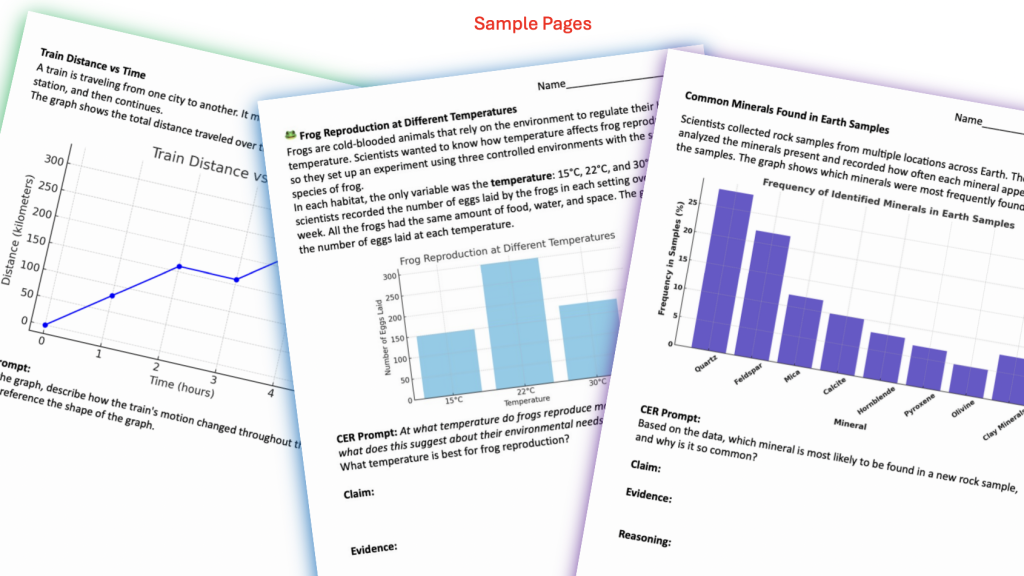 CER Graph Pages: Enhance your middle school science curriculum with this comprehensive set of Claim-Evidence-Reasoning (CER) activities, meticulously aligned with the Next Generation Science Standards (NGSS). Designed to foster critical thinking and scientific literacy, these lessons guide students through constructing well-supported scientific arguments. Use Graphs as Evidence!