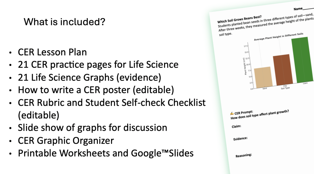 - Twenty-one engaging CER worksheets covering various life science topics