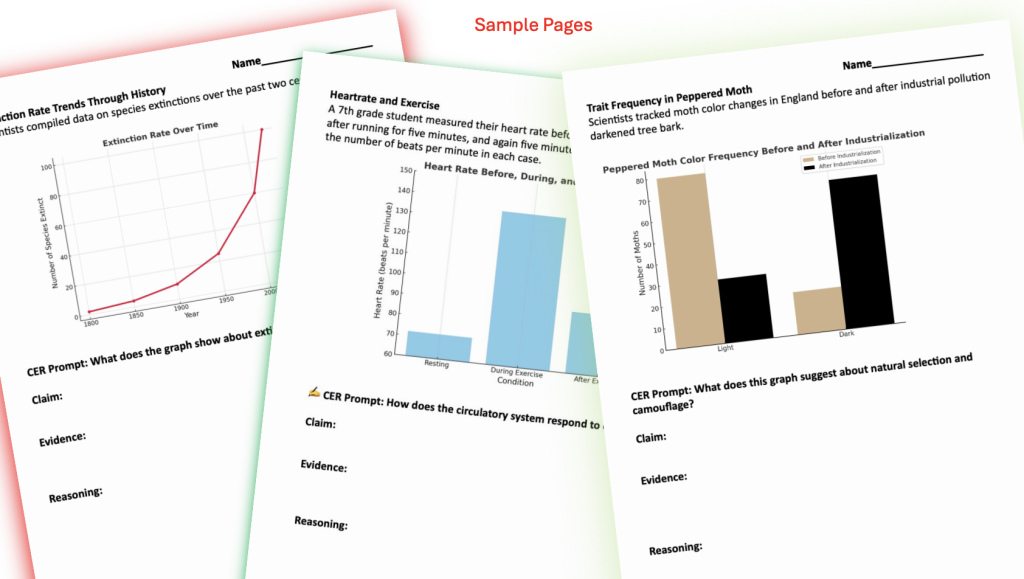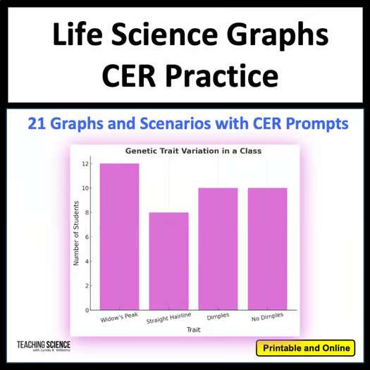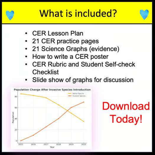 Enhance your 7th-grade Life science curriculum with this comprehensive set of Claim-Evidence-Reasoning (CER) activities, meticulously aligned with the Next Generation Science Standards (NGSS). Students will use a CER Graphic organizer, CER prompt pages, and more to organize their thoughts. Includes a CER Rubric for Grading. Designed to foster critical thinking and scientific literacy, these lessons guide students through constructing well-supported scientific arguments. Students will use Graphs as Evidence!