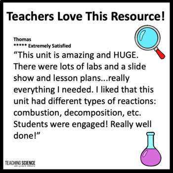This unit is amazing and HUGE. There were lots of labs, a slide show, and lesson plans…really everything I needed. I liked that this unit had different types of reactions: combustion, decomposition, etc. Students were engaged! Really well done!