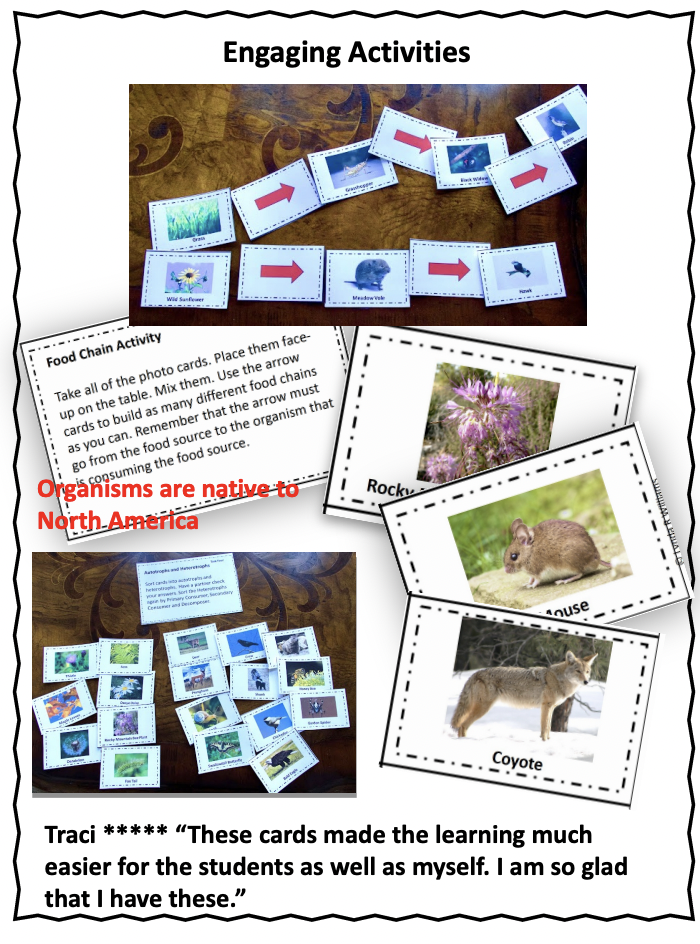 Are you looking for an engaging way to learn about food webs? This resource includes 48 Food Web sorting cards with producers, primary consumers, secondary consumers, and decomposers. Animal and plant species are native to North America. Students will sort cards in 6 different Food Web and Food Chain tasks. Students will identify trophic levels, energy flow, producers and consumers, and more. This resource addresses the Disciplinary Core Ideas for NGSS Ecosystem: Interactions, Energy, and dynamics.