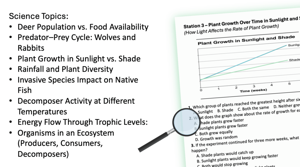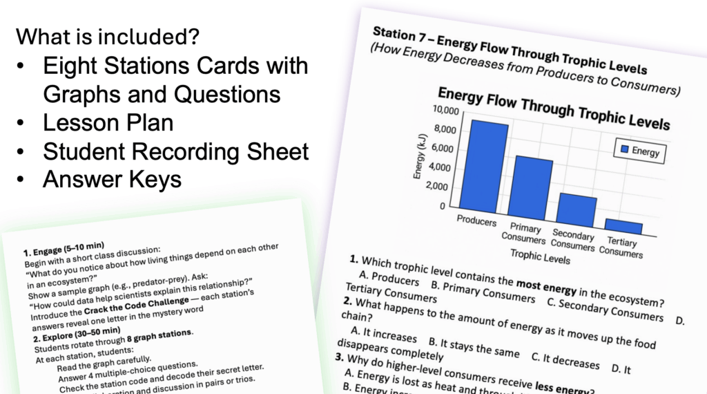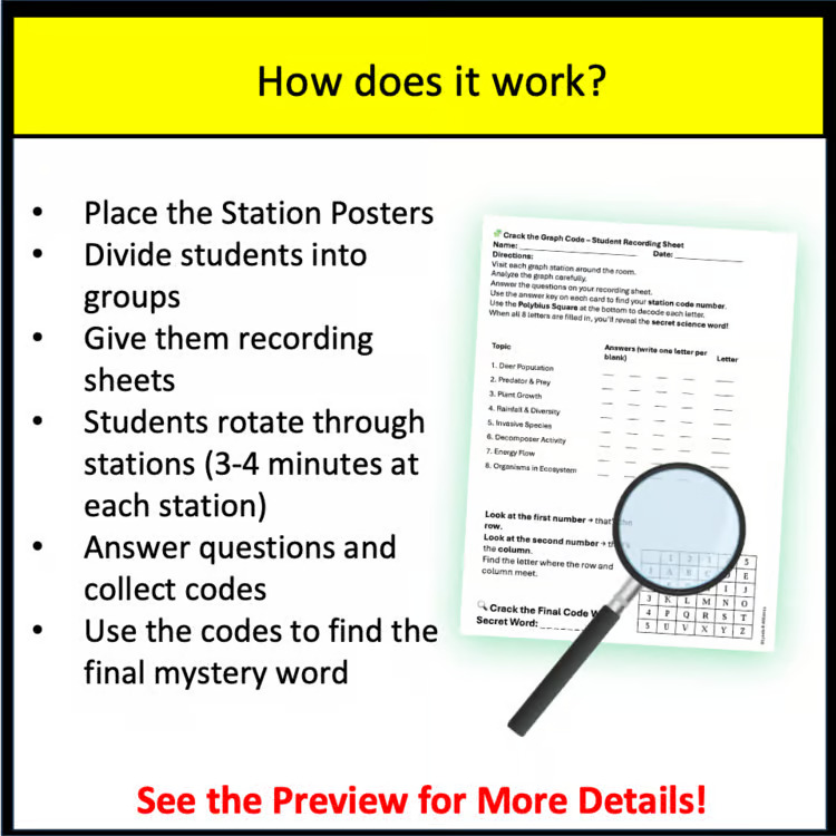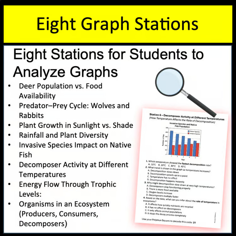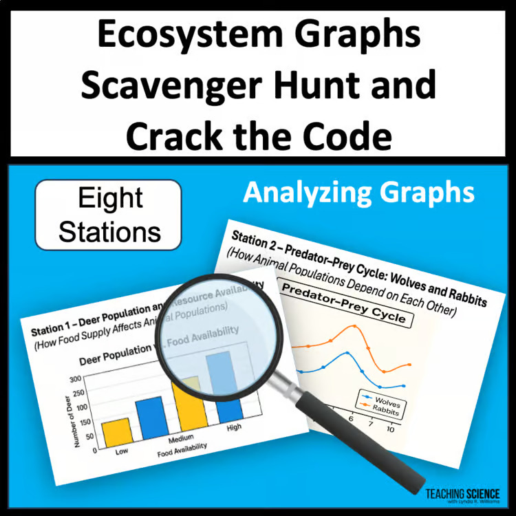 Turn graph interpretation into a fun challenge with this Ecosystem Graphs Crack-the-Code Scavenger Hunt! Students rotate through eight printable graph stations to analyze real-world ecosystem data and uncover a secret science word.