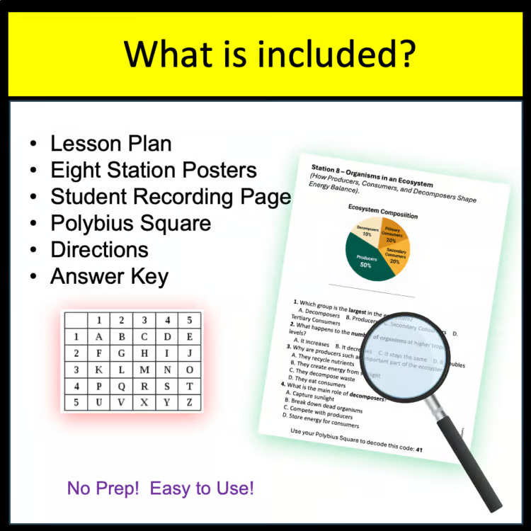 Each station includes a graph, multiple-choice questions, and a code to decode using a Polybius Square. Students interpret data, identify cause-and-effect relationships, and connect patterns to energy flow and survival in ecosystems.