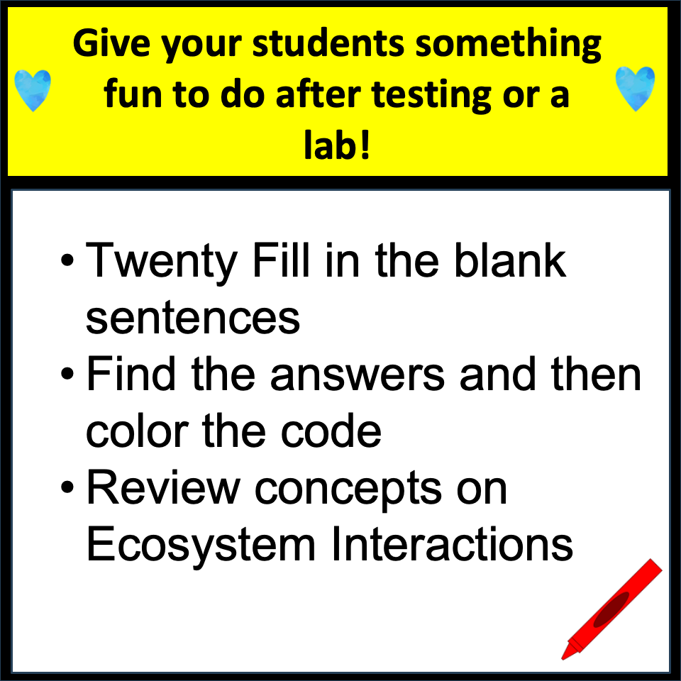 This Ecosystems Interactions Worksheet is a color-by-number science review that will quietly engage your students in a review activity on Interactions in Ecosystems. It is great for fast finishers after state testing or for independent seat work.