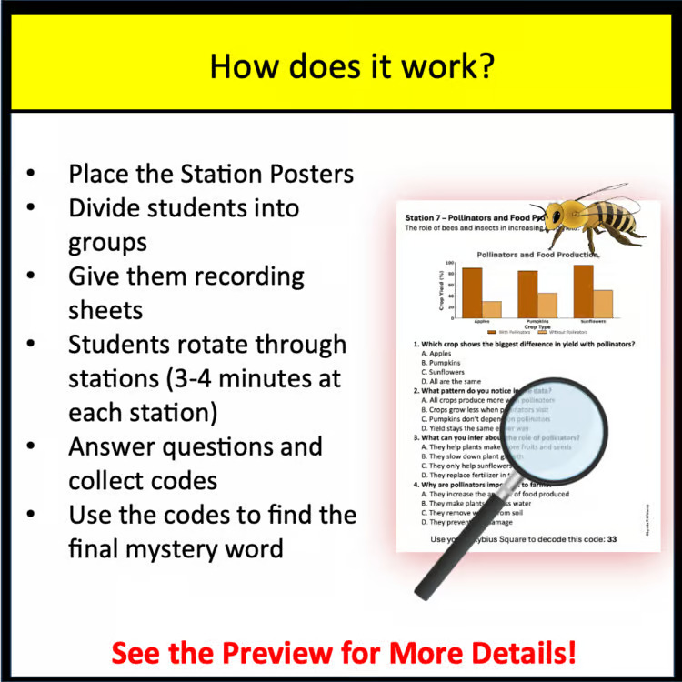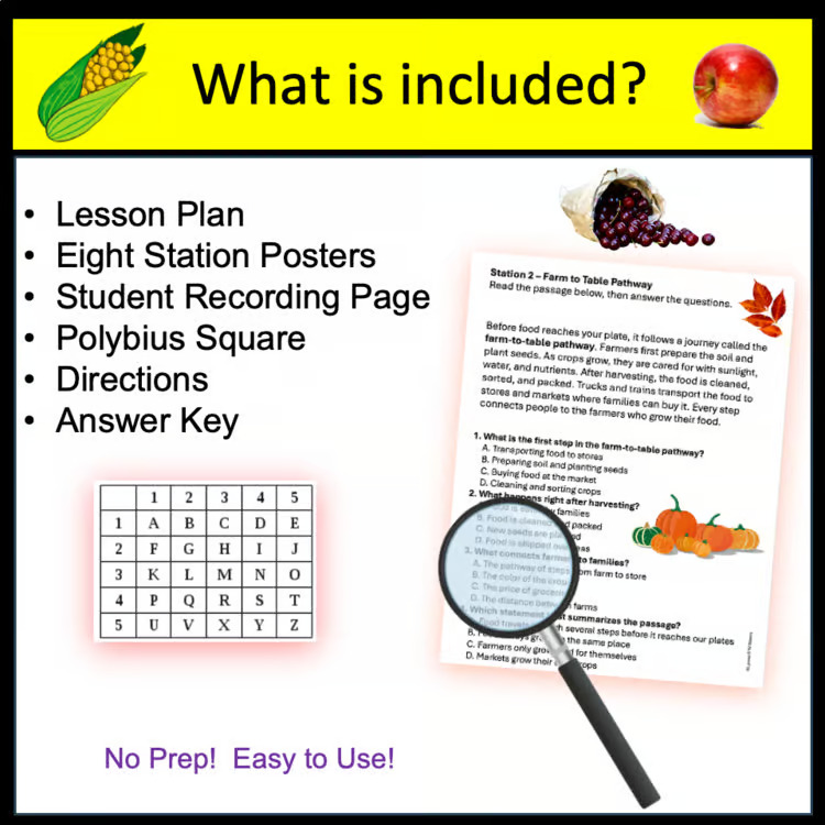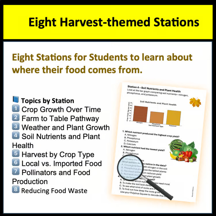 Students rotate through 8 printable stations focused on farm-to-table topics, including crop growth, weather, soil nutrients, and reducing food waste. At each station, they interpret graphs or short passages, answer questions, and collect code numbers that reveal a hidden harvest-themed word when decoded at the end! Bring a little fall fun into your classroom with this Thanksgiving Fall Harvest Crack the Code Science Activity!