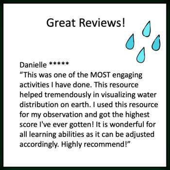 This worked perfectly to supplement our unit on the Global Water Crisis to give students a visual in the distribution of water on Earth. It also worked as a great assessment (for the reflection questions).