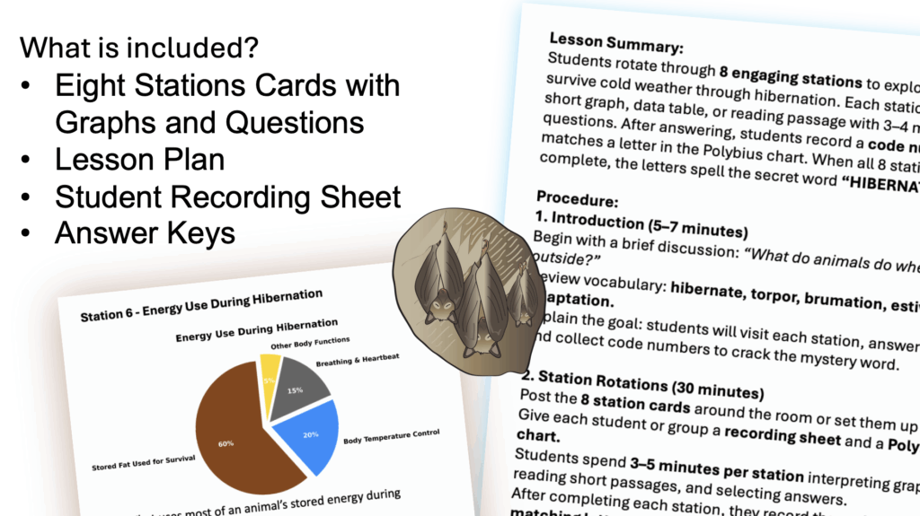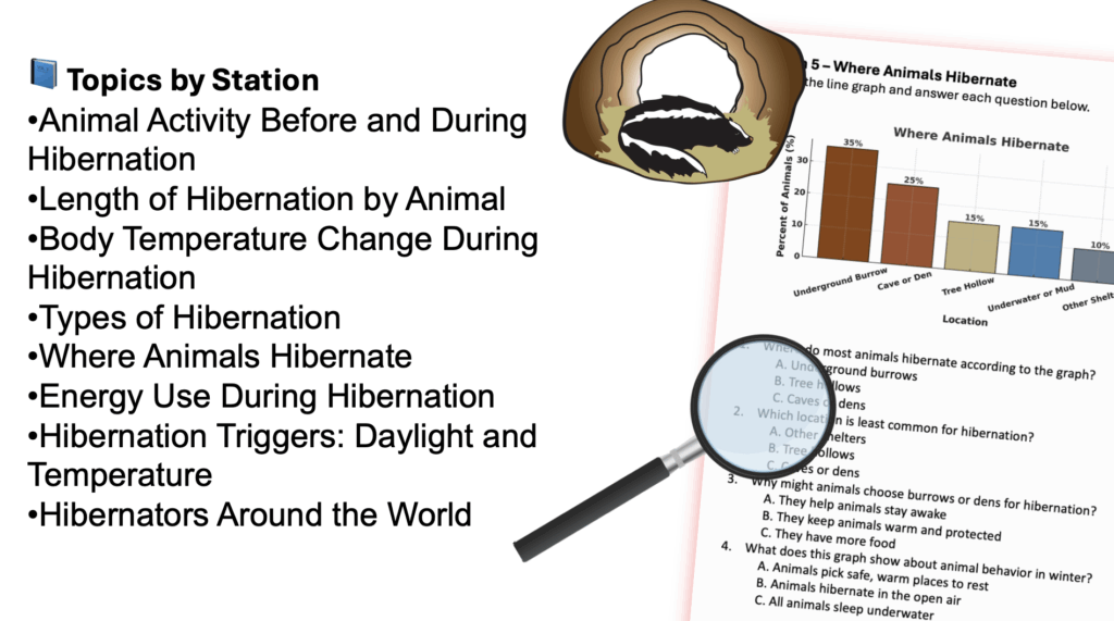 Students move through eight graph-based science stations to explore how animals survive cold weather through hibernation, torpor, brumation, and other adaptations.