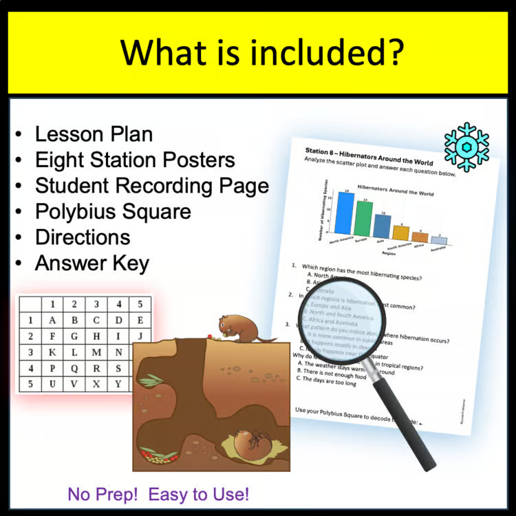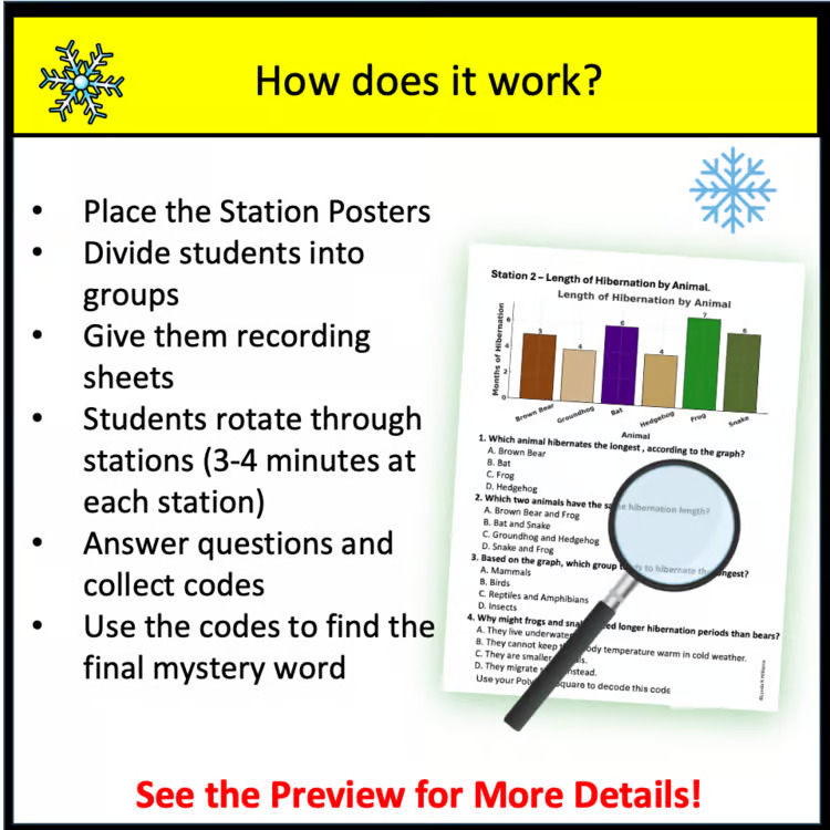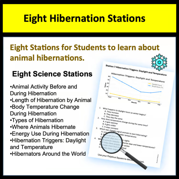 At each station, students read a short passage or interpret a scientific graph, answer multiple-choice questions, and record a code letter. When they finish all eight stations, the letters reveal a hidden word connected to how animals survive winter.