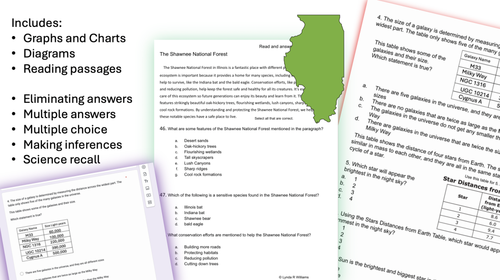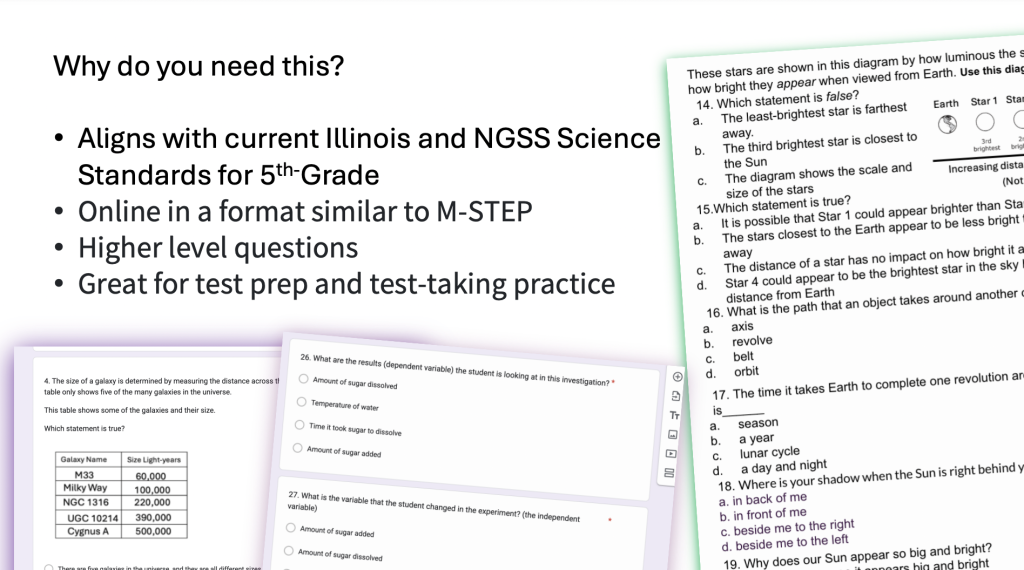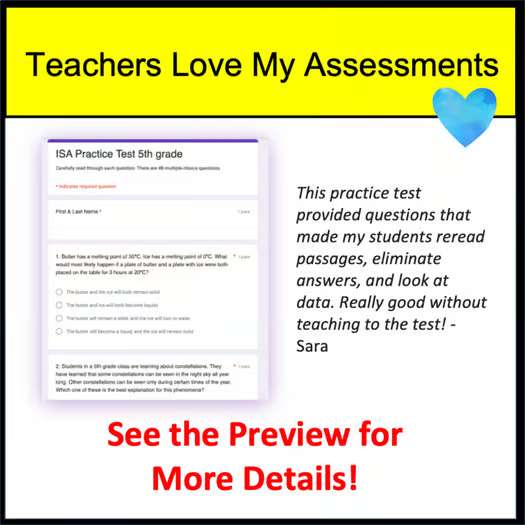 Do you want to prepare your 5th-grade students for the ISA (Illinois Science Assessment)? These questions require students to analyze data, read carefully, look at diagrams and graphs, and practice choosing the best answer. This is great for the 5th Grade Illinois and NGSS Science Standards and 5th Grade science test prep. Get your students ready for the ISA.