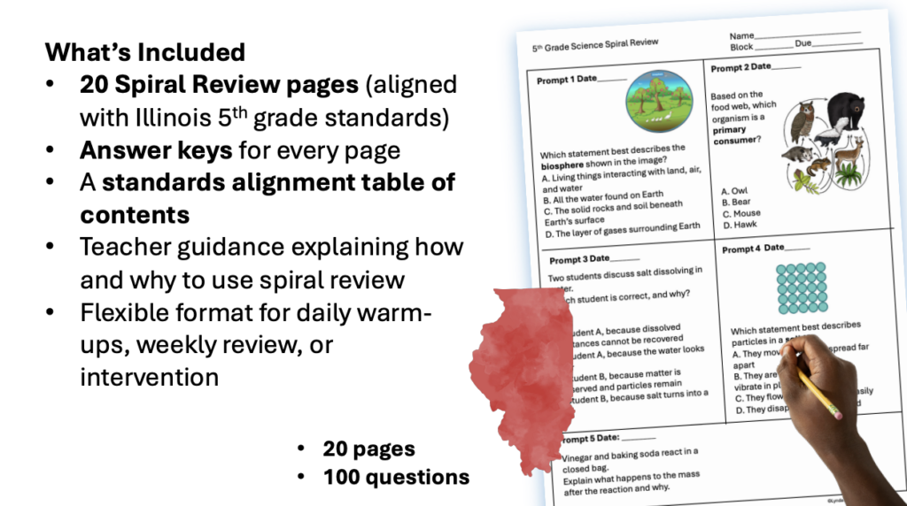 Instead of reviewing one topic at a time, this science spiral review revisits key concepts across physical, life, and earth sciences throughout the set. This helps students strengthen their understanding, improve retention, and apply knowledge as expected on the Illinois Science Assessment (ISA).