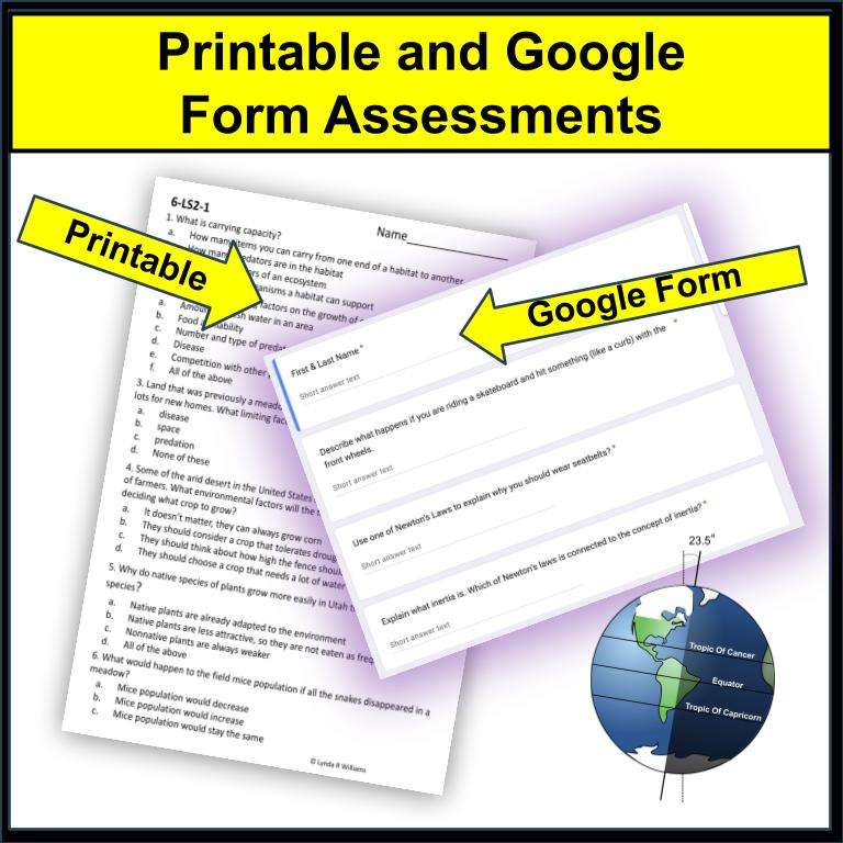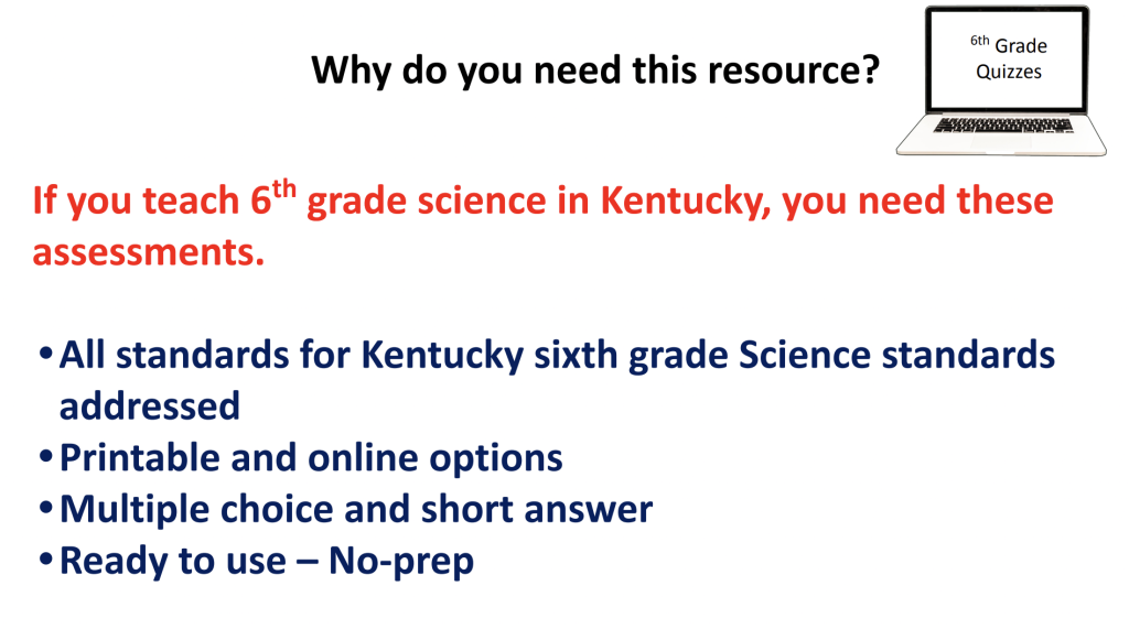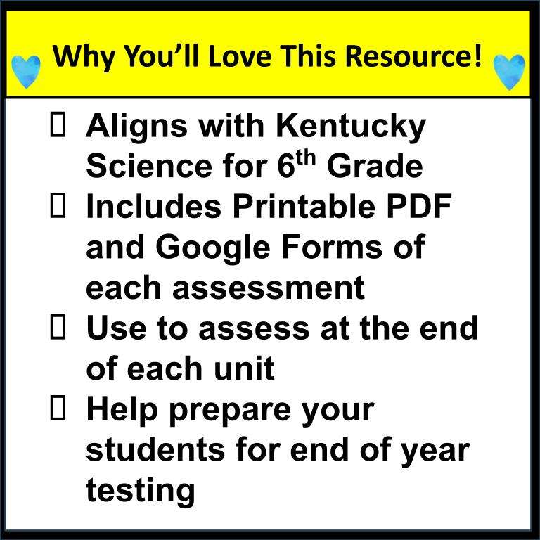 Kentucky Sixth Grade Assessments: This resource is a set of assessments for all of the Kentucky Sixth Grade Standards. It covers all the standards in the Sixth grade strand, including PS1, PS2, LS1, LS2, ESS1, & ESS2. These assessments include multiple-choice and short-answer questions. You can use these after teaching each standard for assessment or as practice and review at the end of the year. Answer Keys are included. Links to Google Forms are in a PDF.
