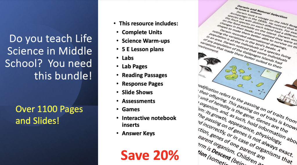 Do you teach life science in middle school? Purchase this bundle and save 20%. This bundle covers all the life science standards for middle school NGSS. LS1: From Molecules to Organisms: Structures and Processes, LS2: Interactions, Energy, and Dynamics Relationships in Ecosystems, LS2: Interactions, Energy, and Dynamics Relationships in Ecosystems, and LS4: Biological Evolution: Unity and Diversity. Students will be engaged in learning about all the life science topics for middle school.