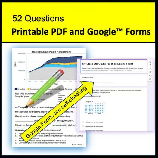 Are you getting your students ready for the NY State Science Test? This science practice test has higher-level questions for middle school science. Students must look at data graphs and diagrams to answer the questions. They must also read back into the text, eliminate answers, choose the best explanation, and more.