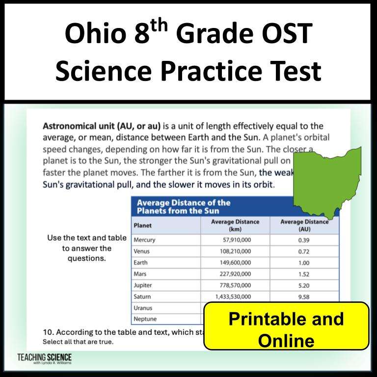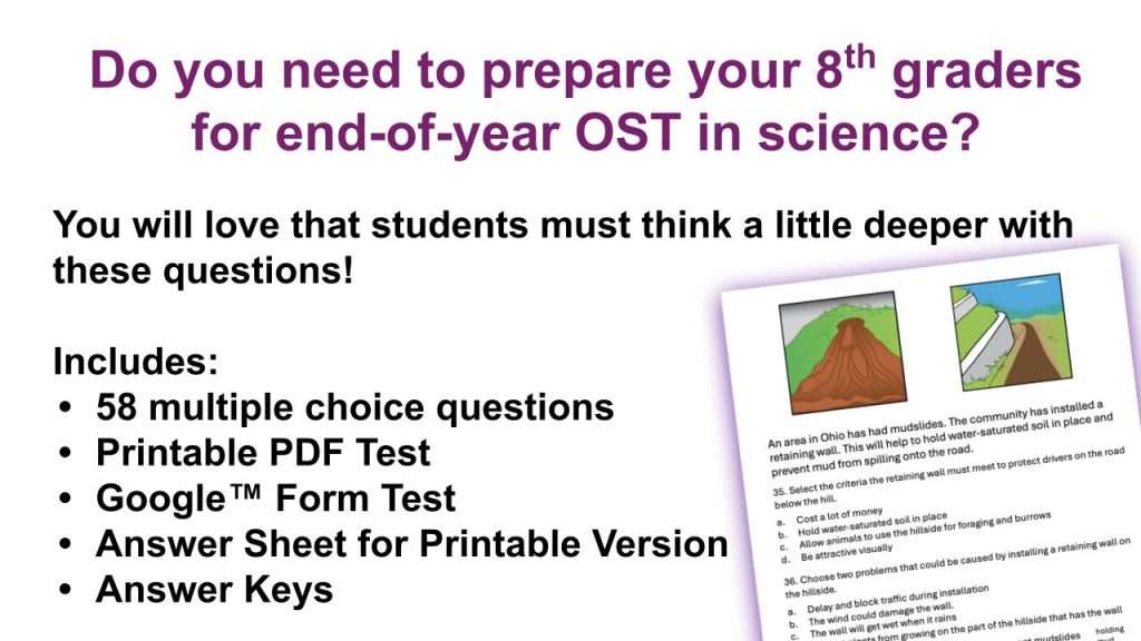 Do you need to prepare your students for the OST in Science, 8th Grade? This practice OST Test will provide questions similar to the OST. This test is printable and in Google™ forms. These 8th-grade Science Test Prep questions require students to analyze data, read carefully, look at diagrams and graphs, and practice choosing the best answer. This is great for Ohio 8th-grade science test Prep. This test prep test is Level II and has higher-level thinking questions. It can be used alongside my Quizzes for Ohio 8th-grade science.