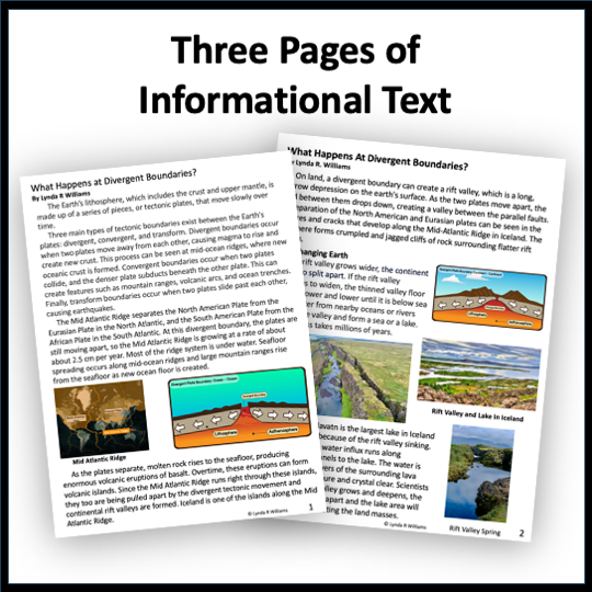 The Earth’s surface is constantly changing. Plate tectonics is what drives these changes. This informational text unit looks closely at what happens at divergent boundaries. Specifically, it explores the rift valley and fissure that runs through Iceland and is part of the Mid-Atlantic Ridge. Students will learn about plate tectonics, divergent boundaries, mid-ocean ridges, seafloor spreading, and rift valleys. **Student pages are in Printable PDF and Google Docs for online use.