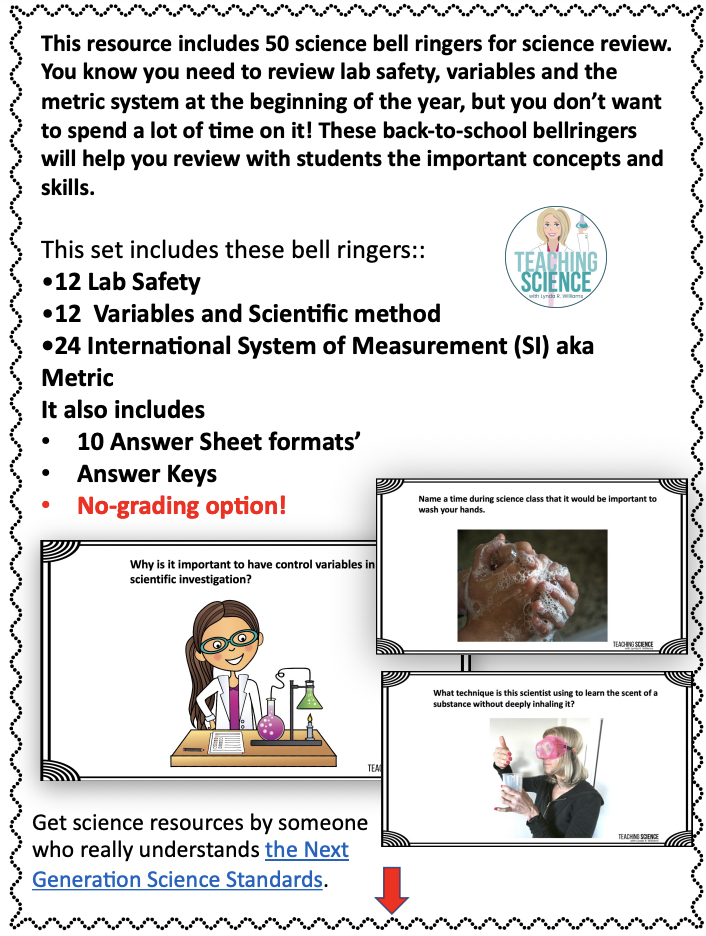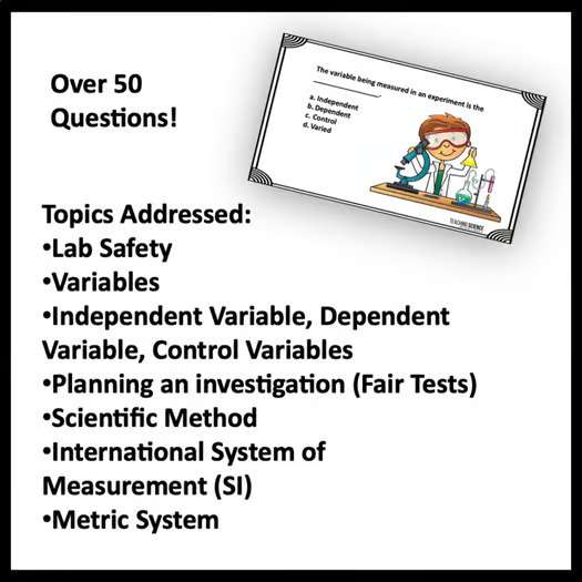 Do you want to review science concepts like lab safety, variables, and the metric system? These bell ringers can be used as a quick review of science concepts and as conversation starters. This set includes Lab Safety, Variables, Scientific Investigation, and the International System of Measurement (Metric System). These are great for test prep! There are 50 bellringers in the slide show presentation. Answer sheets in a variety of formats are included. Answer keys for each warm-up are included. This set of bell ringers focuses on back-to-school science content: Lab Safety, Variables, and Measurement (SI)