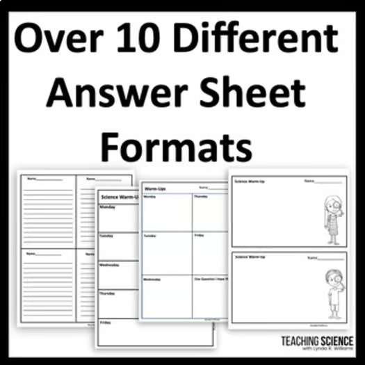 - 10 different answer sheet formats (weekly, quarter sheet, half sheet, science notebook, etc.)