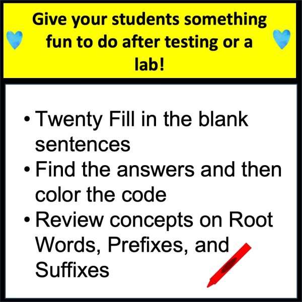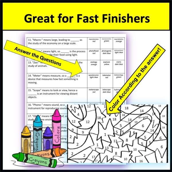 This Science Vocabulary Worksheet is a color-by-number science review that will quietly engage your students in review activity on Science Root Words and Prefixes. It is great for fast finishers after state testing or for independent seat work.
