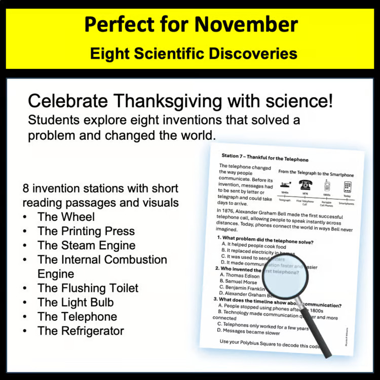 This low-prep resource brings together STEM history, data analysis, and literacy skills, all wrapped in a Thanksgiving theme focused on innovation and gratitude.