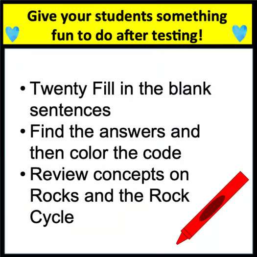 Do you need End of Year Color by Code for science review? This color-by-number is on the rock cycle and rocks and minerals. It is great for fast finishers after state testing or for independent seat work, and it is also great for review. Do you want your fast finishers to have a resource that reviews earth science and the rock cycle? This is a great little no-prep activity for you.
