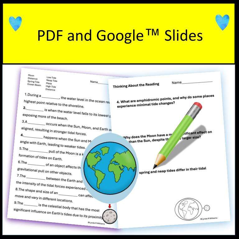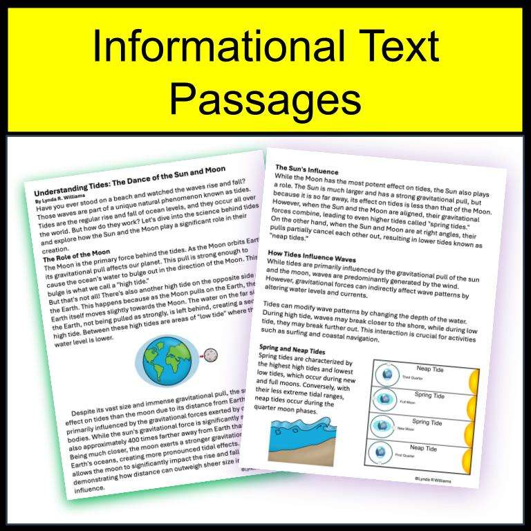 Teach your students what causes the ocean tides! This no-prep science informational text on Tides will engage your students in this fascinating phenomenon. Students will learn about the gravitational pull of the Sun and the Moon and what spring and neap tides are.