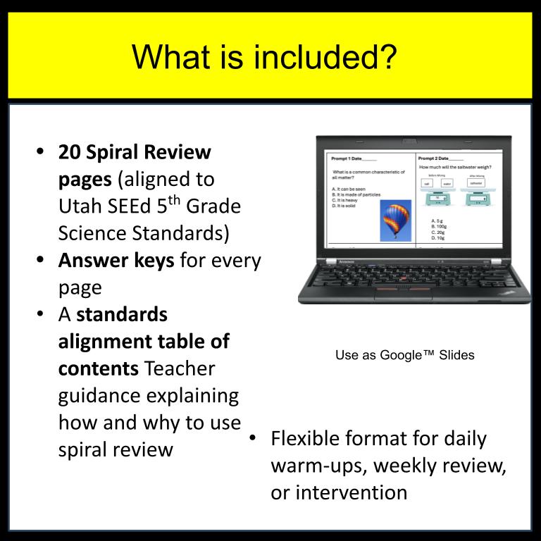 Plus- background on Spiral Review, Ways to use, and Table of Contents aligned to Utah SEEd 5th Grade standards (all standards addressed)