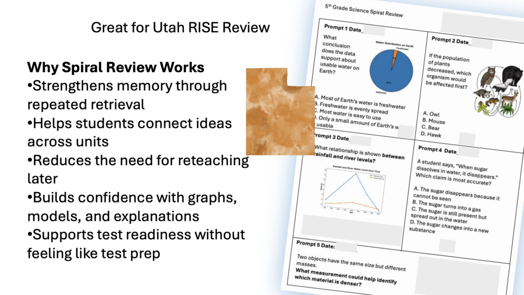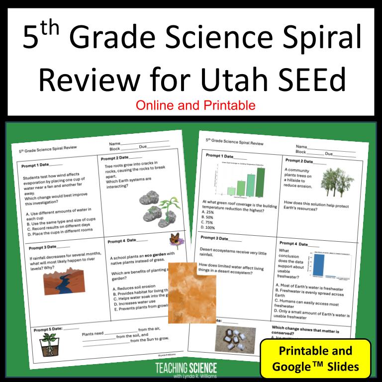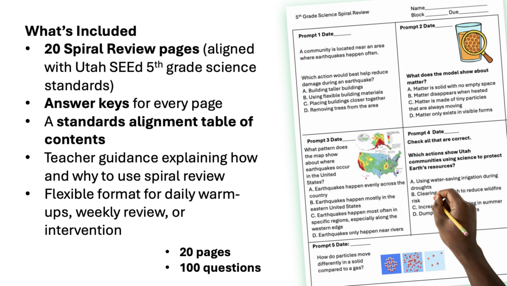 This Utah SEEd 5th Grade Science Test Prep & Spiral Review is designed to support long-term learning while keeping daily review easy to manage. Research shows that frequent, mixed spiral review improves retention—and this resource puts that into practice with short, focused warm-ups aligned to Utah RISE expectations.
